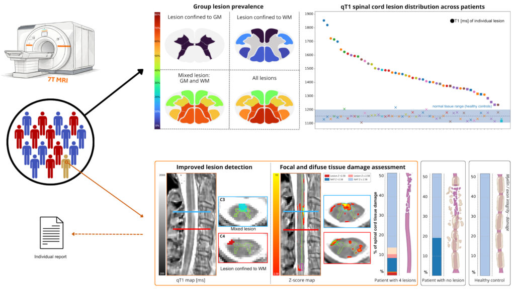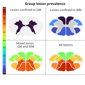 Dans cette étude exploratoire, menée chez 15 patients présentant une sclérose en plaques récurrente-rémittente et 15 témoins sains appariés selon l’âge, réalisée en partenariat avec le service de Neurologie – Maladies Inflammatoires du Cerveau et de la Moelle Epinière (MICeME, Hôpital de la Timone, APHM), la topographie et la distribution des lésions ont été analysées à l’échelle du groupe. Une analyse globale à l’échelle de l’individu, qui pourrait être utilisée en routine par les cliniciens pour le suivi et l’évolution pronostique, a été proposée pour évaluer rapidement l’intégrité tissulaire de la moelle. Des atteintes structurelles infracliniques au stade précoce de la maladie ont ainsi pu être montrées.