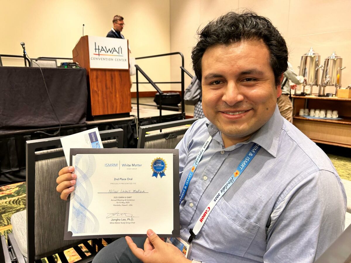 Congratulations to Nilser Laines Medina for his 2nd place award from the White matter study group ISMRM 2025 for his work directed toward automatic multiple sclerosis lesion segmentation in the spinal cord on 3T and 7T MP2RAGE images.